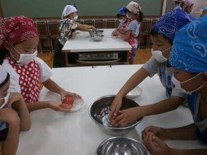 2校時の2−1に引き続き,トマトソース作りをしました。