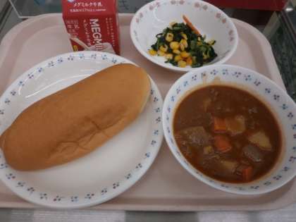 ミルクコッペパン・牛乳・トマトシチュー・小松菜のソテー・角チーズ