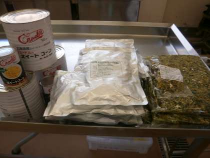 ※今日の給食は,台風にそなえて学校で保管しておいた缶詰や乾物を使って作りました。ソース焼きそばには,今回,チキンささみを使っています。