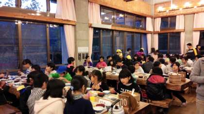 夕食を食べています。バイキング形式で,それぞれがメニューを選んで食べています。