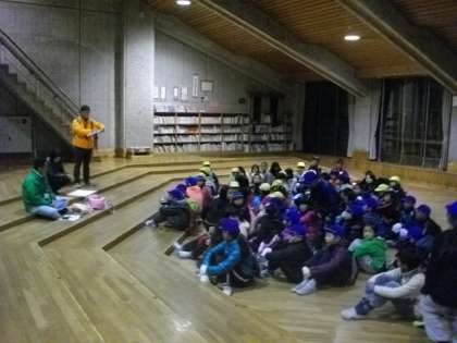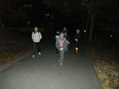 7時30分 ナイトハイクに出発です。ペットボトルを加工して作ったカンデラ(ろうそくいり)をたよりに,班ごとに散策します。