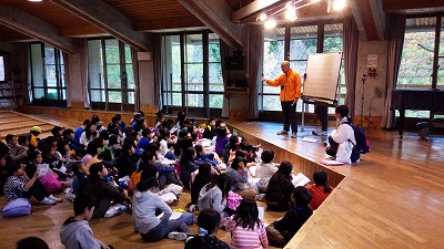 【花背山の家第2日目の活動の様子】 6時30分に起床後、4校合同で朝の集いをを行い、それぞれの学校紹介を元気よくしました。朝食後、登山の準備をして、9時20分より正親小学校と合同で登山を開始しました。何回か休憩をとりながら、頑張って天狗杉のある頂上に全員登り切りました。険しい山道でした。頂上付近で、おにぎり弁当を食べ、遠くに鴨川や御所の見えるところで記念写真を撮りました。本当にきれいでした。下山も険しい山道を少しずつ降りていきました。約6時間かけて、山の家まで降りてきました。誰ひとり怪我なくおりてこられたのが大変よかったです。本当に子どもたちはよく頑張りました。現時点では、みんな元気に過ごしています。この後、予定通り、学習発表会の英語劇の練習をします。そのあと、入浴し夕食となります。夜は、家族の方々への手紙を書く予定です。<学校長メール配信内容より抜粋>