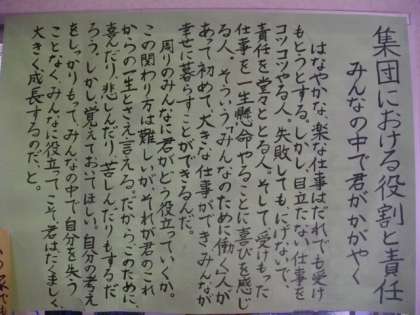 この山の家での活動で,子どもたちががんばっていることがたくさんあります。その一つに,「指示を待つだけでなく,自分で考えて行動することができる姿」があると感じています。次の予定を考えて用意をすることや,時間を考えて5分前行動をすること,また友達の気持ちを考えて自分ができることを行動で示すこと,などです。5年生の教室の前には,「みんなの中で君がかがやく」というメッセージが掲示されています。このメッセージに込められた願いをしっかりと受け取めてくれた5年生の子どもたちは,一段とたくましく,頼もしく活動をしてくれています。最後の一日を,楽しく元気に活動してくれることと思います。