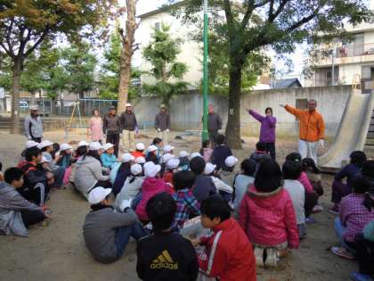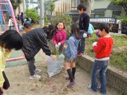全校でごみゼロの取組をしました。1〜4年生は校庭の石ひろいや落ち葉集め,花壇の雑草抜きをしました。5・6年生は近くの公園へ行き,地域の方と一緒に掃除をしました。たくさんの落ち葉や雑草を集めることができました。少し肌寒いお天気でしたが,心も体もあたたかくなりました。