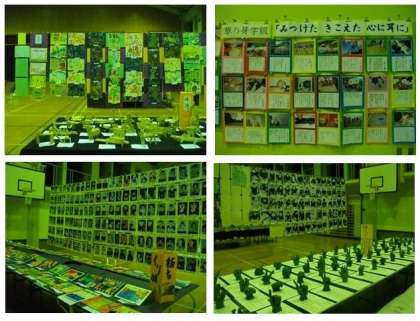 1年:平面作品「いろいろぺったん」「お話の絵」「のってみたいな」立体「はこのなかまたち」,2年:版画「うつしてみると」お話の絵「アマンディーナ」他 立体「まどをひらいて」,3年:スチレン版画「ふしぎな生き物」お話の絵「走る動物病院」他