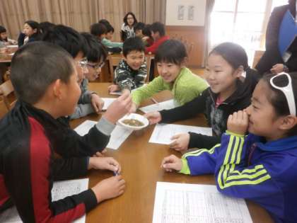 の葉っぱを観察して香り・形・色などをワークシートに記入しました。次にそれぞれのお茶を飲んで,香り・色・味など感じたことを書きとめました。