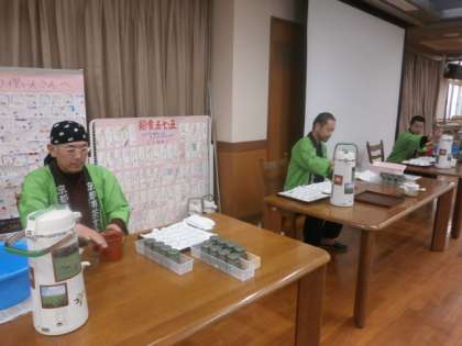 茶香服・・・「茶香服」とは,数種のお茶を自分自身の感覚で鑑別する競技です。南北朝の頃に京都を舞台に文化人の遊びとして流行しました。現在では,服装や細かい礼儀作法には,とらわれず,誰もが参加できる風流な品質飲みあてゲームです。