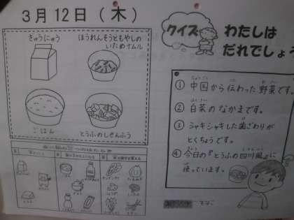「とうふのしせんふうがおいしかったです。さらに中国のチンゲン菜があってすばらしかったです。」・・・・・3年生の感想から