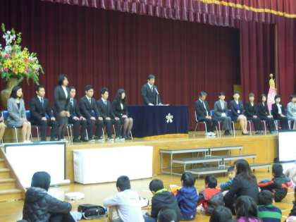 平成27年度着任式と始業式がありました。たくさんの教職員の方を新しくお迎えしました。始業式では西田校長先生から,「こつこつ」がんばろう,「ぱちぱち」と相手に拍手を送るやさしい心をもとう,みんなが「にこにこ」と笑顔で過ごせるようにしようというお話や,あいさつの大切さについてのお話がありました。