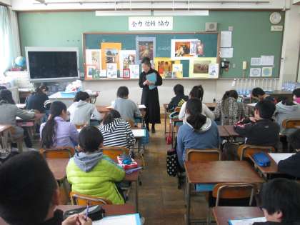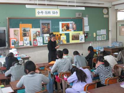 今日の授業では,自己紹介と様々な絵画の鑑賞を行いました。普段ふれあう機会が少ない絵や,なじみのある絵を何点も鑑賞し,「知ってる。」といった声や「どんな意味のある絵なのかな。」などといった声が上がっていました。