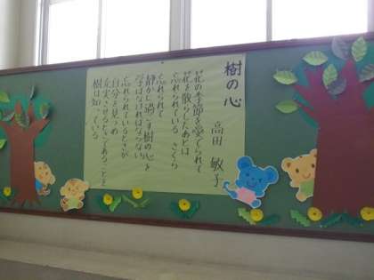 「樹の心」という詩が階段の掲示板にはってあります。毎月,子どもたちの心に響く詩を届けたいと思います。