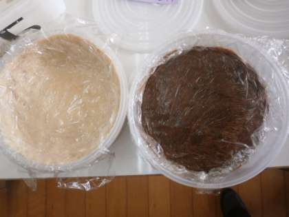 昨年度作ったみそと出来上がったばかりのみそを並べて比べてみると,色も香りもずいぶん違っていて,子どもたちも興味深く見ていました。