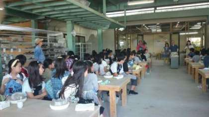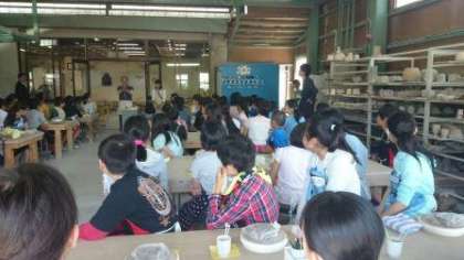 最初の目的地,陶磁器センターに着きました。みんな真剣に陶芸についての話や作り方の説明を聞いています。