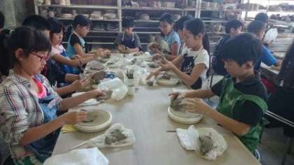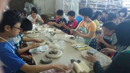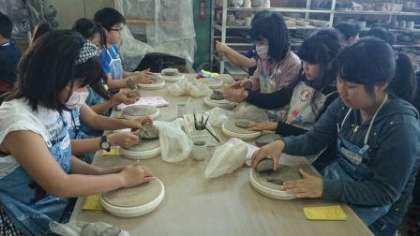 陶磁器センターのお話の後,各テーブルで陶磁器の作品作りをしました。