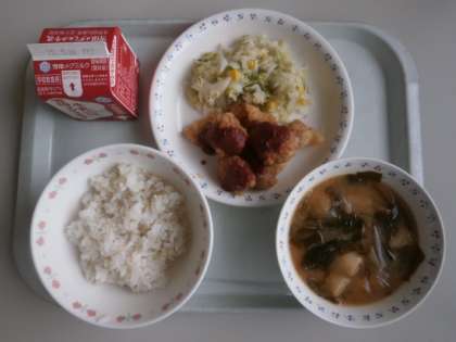 14日(木)の献立は,「麦ごはん,牛乳,チキンカツ,ソテー,みそ汁」でした。チキンカツは,給食室でパン粉をつけて揚げています。ソースも手作りです。ソテーは,春キャベツをたっぷり使用しました。みそ汁は,地産地消の物資の京北みそを使用しました。児童の感想を紹介します。「私は今日の給食でチキンカツが一番おいしかったです。みそ汁も具がたくさん入っていておいしかったです。また食べたいです。」(5年児童)「今日の給食のお味噌汁は,とてもあったかくて,とても体が温まりました。チキンカツは,たれとあっていたので,とてもおいしかったです。」(3年児童)