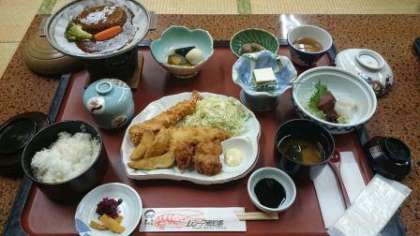 宿舎の夜ご飯は,刺身や揚げ物などいろいろな種類のおかずがたくさんあって,食べきれないくらいありました。「いただきます」の挨拶を待っているところです。