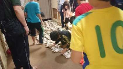 修学旅行1日目最後の活動は,グループミーティングです。グループミーティングは広間に集合したのですが,入口で一生懸命スリッパを並べる姿をみることができました。校外学習でも,人が使うことを考えた思いやりのある行動が素敵です。