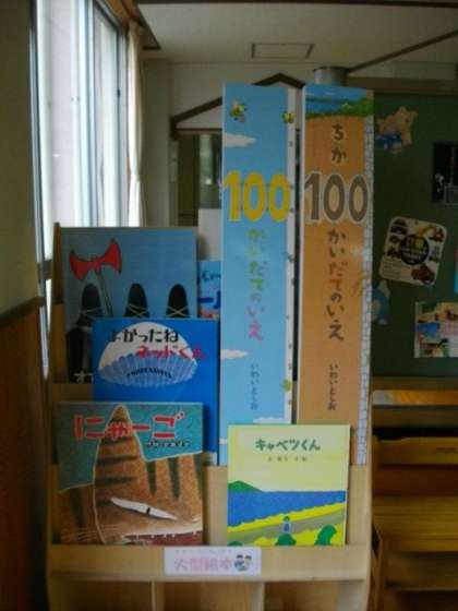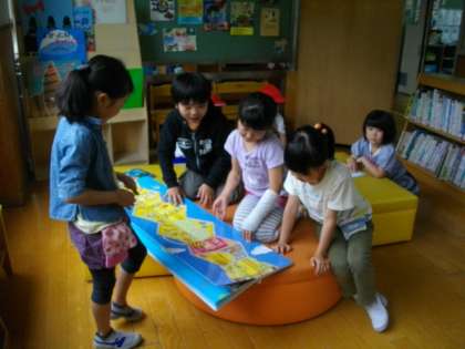2階にある絵本のコーナーでは,休み時間に子どもたちが読書を楽しんでいます。教育後援会から寄贈いただいた大型絵本は,読み聞かせ用につかっていますが,普段も大人気の本です。1ページめくるごとに,歓声が聞こえてきます。