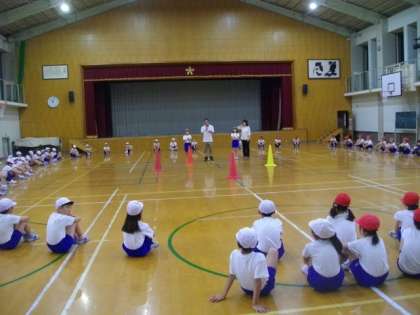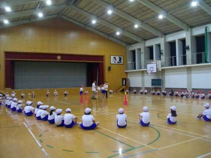 4年生が体育館で,みさきの家でのキャンプファイヤーの練習をしています。今のところ,週間予報では,曇り時々晴れの予報です。