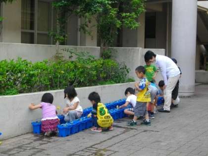 1年生が,毎朝,朝顔の水やりをしています。「みてみて!」「どんな花が咲くのかな,楽しみ!」毎日大きくなる朝顔をみて,子どもたちはたくさんお話をしてくれます。