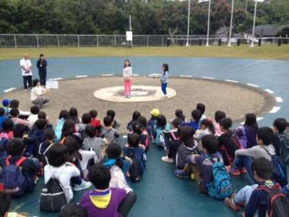 営火場に移動し,入所式を行いました。児童の代表があいさつをしたり,二条城北小の旗をあげたりしました。