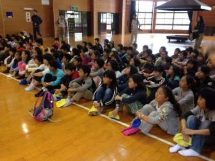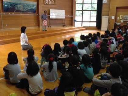 プレイホールに集まり,みさきの家の先生のお話を聞きました。寝る準備やシーツのたたみ方などについて教えていただきました。