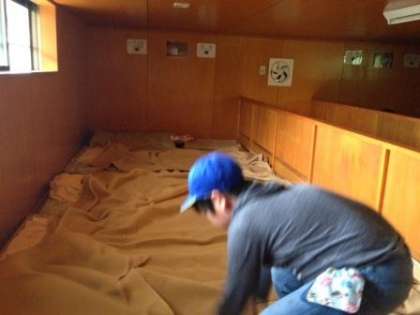 入浴を終え,寝る準備をしました。今日の寝る場所は,男子はバンガロー,女子はテントです。みさきの家の先生に教えていただいた通りに,上手にシーツをしくことができました。