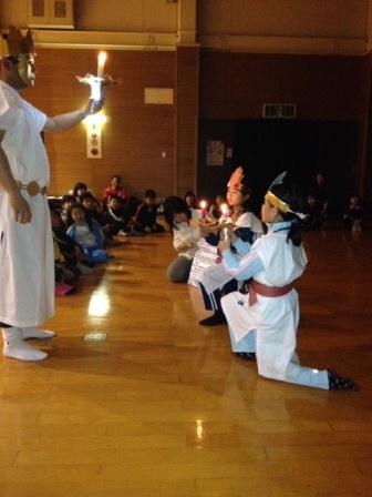 火の神と火の子たちが登場し,キャンプファイヤーが始まりました。「もえろよもえろ」を歌って,キャンプファイヤーの火が大きくなるのを盛り上げました。