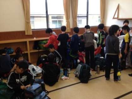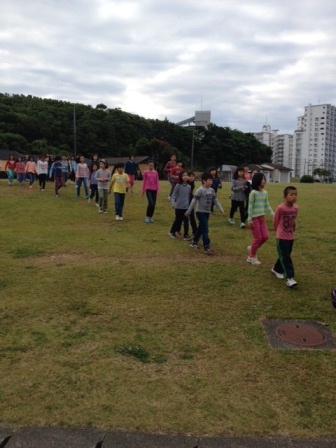 今朝の朝のつどいは,他の小学校と合同で行います。90畳の部屋で準備をして,営火場へ集合します。