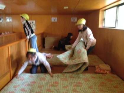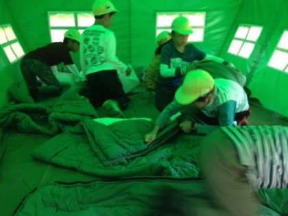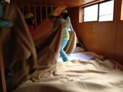 朝食の後に,今夜の寝る場所の準備をしました。今日は,女子がバンガロー,男子がテントに泊まります。友だちと協力してシーツや毛布,シュラフをしきました。