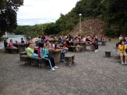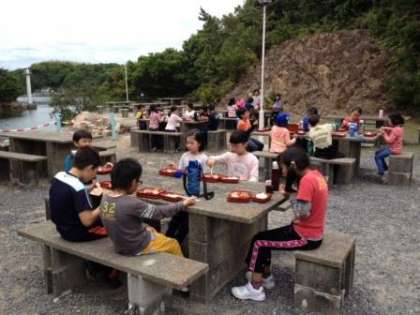 今日の昼ご飯は,野外炊事場にある食事場所で食べました。午後からの活動では,野外炊事でカレーを作る予定です。
