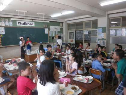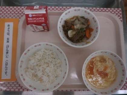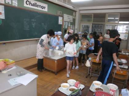 22日(金)の献立は,「玄米ご飯,牛乳,焼肉、トマトと卵のスープ」でした。5年生は,おかわりにたくさん並んでモリモリ食べていました。大変暑い日でしたが,食べやすい献立で,しっかり食べきっていました。児童の感想を紹介します。「焼肉がおいしかったです。なぜかというと,たまねぎが甘くてシャキシャキしていたからです。また作ってください。」(5年児童)「トマトと卵のスープがおいしかったです。トマトと卵が合っていておいしかったです。また食べたいです。」(5年児童)「今日は,焼肉のピーマンが苦手だけどちゃんと食べることができてうれしかったです。」(3年児童)