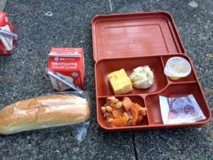 今日の朝ごはんは,昨日カレーライスを作った野外炊事場で食べました。天気はとてもよく,晴れています。