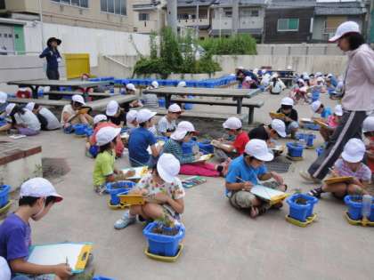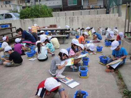 毎日水やりをして育てているトマトの観察をしました。黄色い小さな花が咲き始めました。細かいところまで見て絵をかきました。このあと,国語の「かんさつ名人になろう」で学習したことを生かして観察文を書きます。