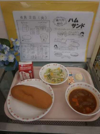 2日(火)の献立は,「コッペパン,牛乳,ハムサンド(具),トマトシチュー,型チーズ」です。ハムサンドは,自分でマヨネーズをかけて混ぜて作り,パンにはさんで食べます。トマトシチューは,手作りルウを使いました。児童の感想を紹介します。