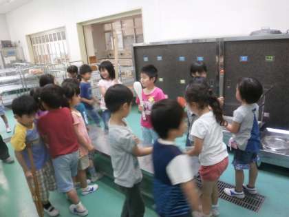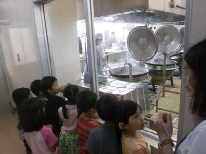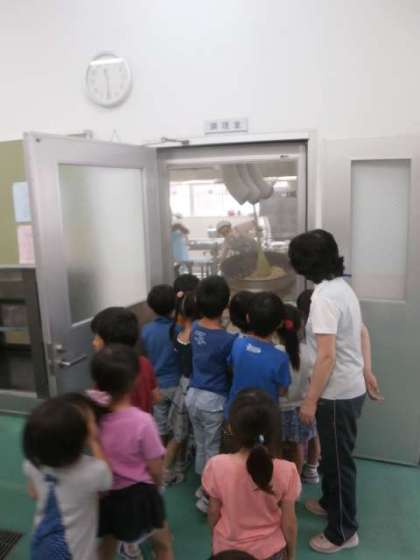 大きな回転鍋で,トマトシチューをグツグツ煮込んでいる様子をみて,「給食室の中は,ここよりもっと暑いんやんな〜。調理員さんはその中でやっているの?」「すごーい!!」と,子どもたちは熱心に見ていました。