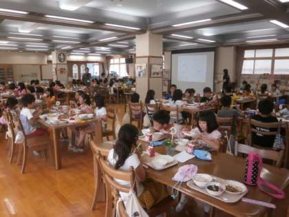 6月1週目は,3年生3クラスの交流給食です。教職員も入れると,100名以上がランチルームに入って一緒に給食を食べました。違うクラスの友達と給食を食べるので,少しお話が多くなってしまうこともありますが,みんなと食べると楽しいから,いつもより頑張って食べることができたという感想もありました。後片付けなども協力して行っていました。
