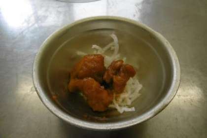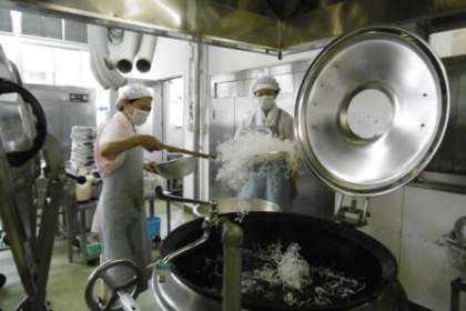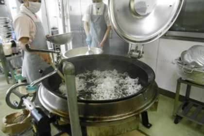 今日は,新献立「けいにくのチリソース・パリパリはるさめ」です。はるさめは,油であげると一気にふくらみます。はるさめの量に気をつけながら,大きな鍋で揚げました。
