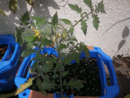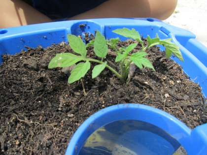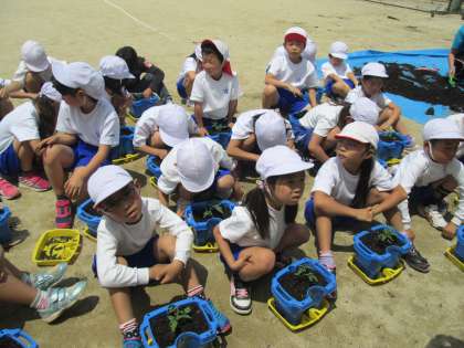 2年生が,5月14日に苗植えしたトマトの苗が大きくなり,小さな黄色い花や緑のトマトの実が見え始めました。