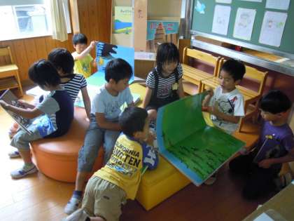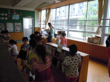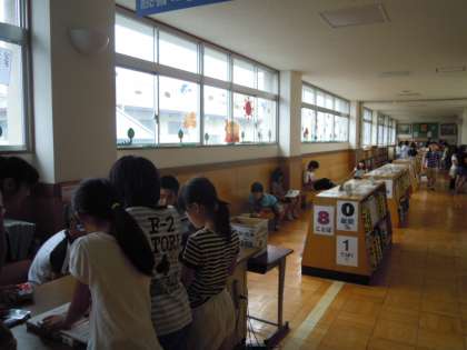 中間休みに2階の図書のコーナーやライブラリーロードには,たくさんの子どもたちが,本を読んだり,貸し出しや返却に来たりしていました。大型絵本も人気があり,友だちと一緒に楽しく読んでいます。