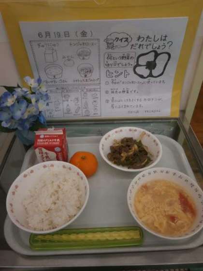 19日(金)の献立は「胚芽米ごはん,牛乳,青椒肉絲,トマトとたまごのスープ」です。夏野菜のトマトとピーマンを使用し,色鮮やかでした。ピーマンやトマトは苦手な児童が多いものですが,本校565食分の残さいの少なさにびっくりしました。