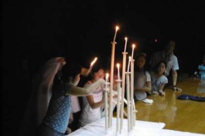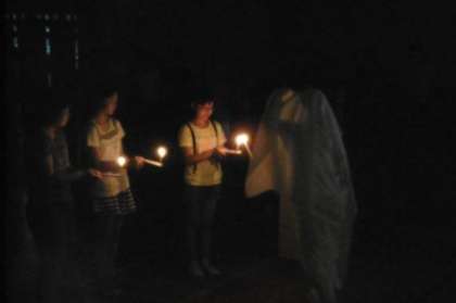 夕食の後は,キャンドルファイヤーをしました。初めに火の神が登場し,火の子たちとともにキャンドルに火を灯しました。