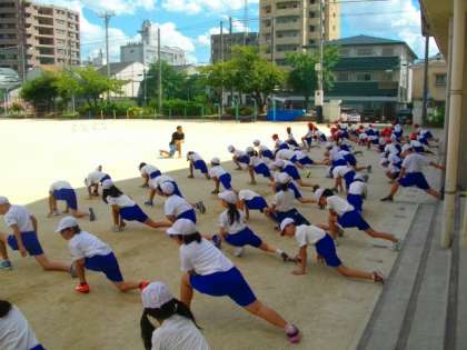 4年生がハードル走の練習を進めています。準備運動をしっかりして,元気いっぱいに取り組んでいます。