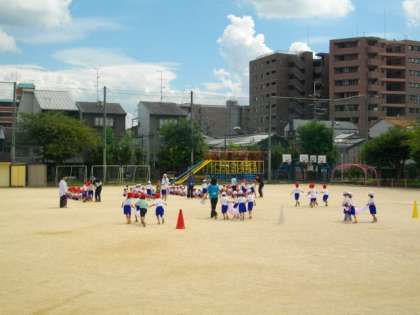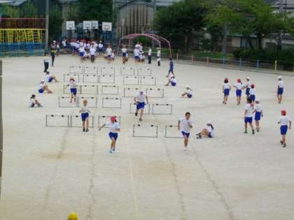 準備運動をしたあと,ハードル走をしています。団体競技の練習も始まりました。