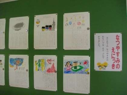 1年生の教室前には,夏休み中に見たり聞いたり体験したりしたことをかいた絵日記が掲示されています。(本ページでは,絵日記の「絵」の部分だけを一部ご紹介しています。)また,各学年の教室前には,自由研究や工作の作品が飾られています。