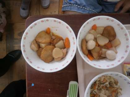 4年生で,一緒に食べた子供たちに好きな献立を聞くと,「カレー,かきたま汁,平天が好き」と答えていました。「平天は何からできているのかな?」と聞くと,「油揚げ」と答える子もいました。平天は,「白身の魚のすり身からできているよ。」と伝えると,「へー,知らなかった。かまぼこと一緒だ。」と気がついてくれました。