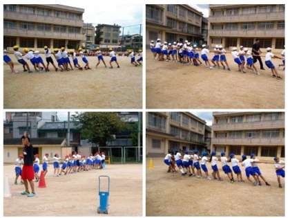 5年生は綱引きの練習をがんばっています。各色で作戦を考えて,勝利を目指します。