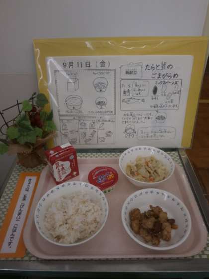 たらと豆のごまがらめは,たらと金時豆,大豆,手亡豆,枝豆を油であげて,手作りの甘辛いたれとごまをからめました。3年生では,いろいろな豆を探しながら,味わって食べていました。豆が苦手な子もこれはおいしいと喜んでいる姿もありました。