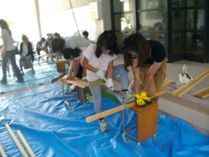 協力しながら,本立てやいすを作っています。