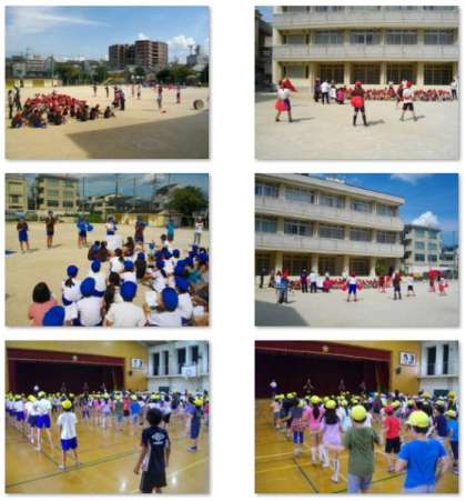 フリータイムの練習風景です。運動場では紅組と青組が応援の練習をしています。体育館では,全校ダンスの練習をしています。